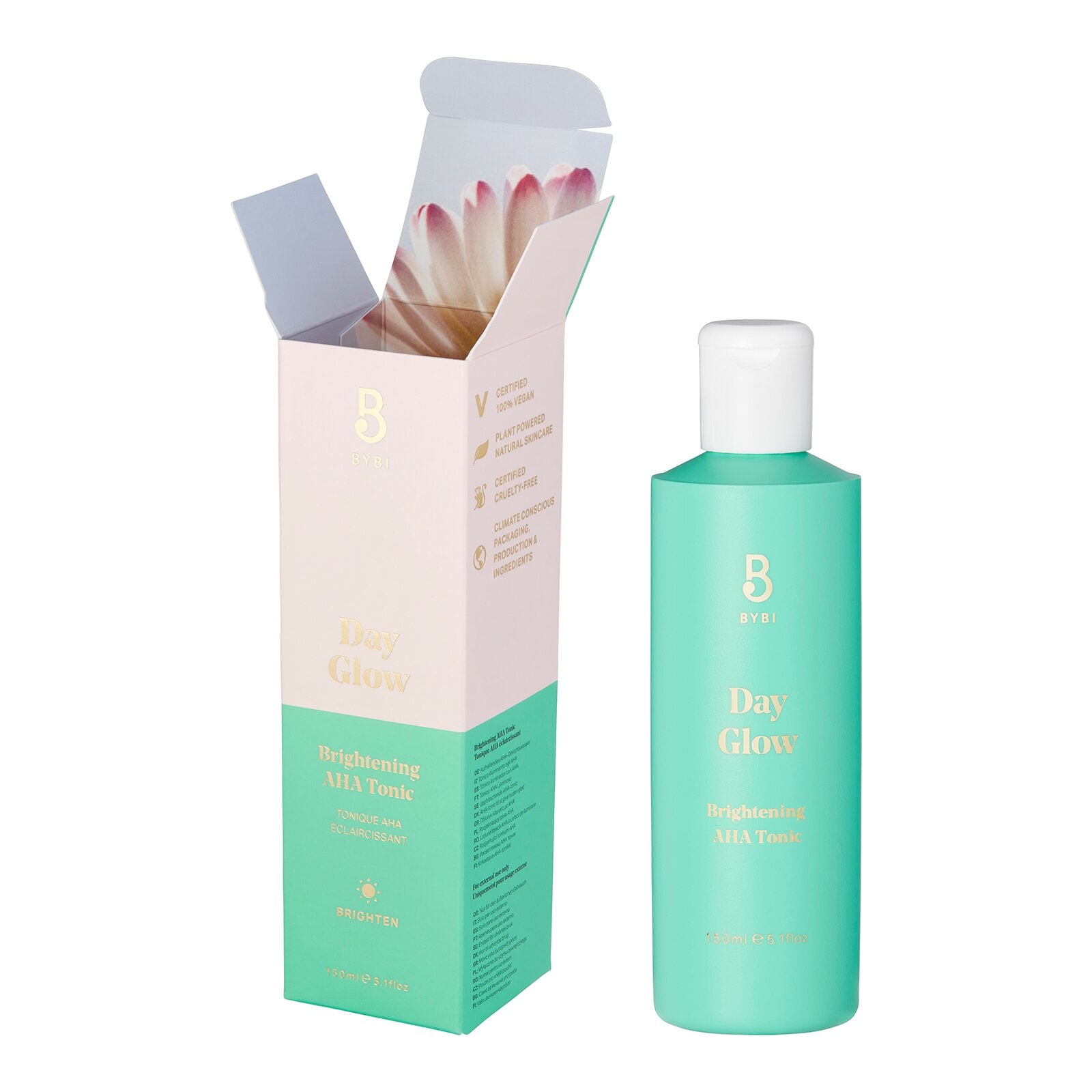 Bybi Beauty Day Glow Brightening AHA Tonic on jokapäiväiseen käyttöön sopiva kasvovesi kirkastavalla ja ihon hehkua edistävällä vaikutuksella. Maitohapon ja kirkastavien ainesosien yhdistelmä kuorii ihoa lempeästi auttaen silottamaan ihon tekstuuria ja tasoittamaan sen sävyä. Yhdistelmä maitohappoa, antioksidantteja ja elvyttävää kukkaisvettä virkistävät ihoa ja antavat sille kasteenraikkaan hehkun. Day Glow kasvovesi sopii kaikille ihotyypeille ja se on sopivan hellävarainen päivittäiseen käyttöön.