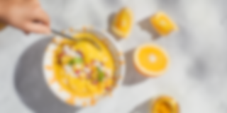Sekoita kaikki ainekset tehosekoittimessa. Tarjoile heti kahdessa kulhossa. Koristele appelsiinipaloilla, saksanpähkinöillä, kookoslastuilla, pakastekuivatuilla vadelmilla ja Life-chiasiemenillä.