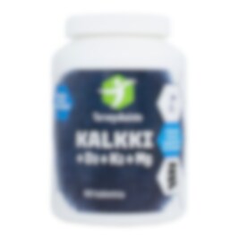 Kalkki + D3 + K2 + Mg -valmisteessa on tarkkaan harkittu yhdistelmä luuston kuntoa tukevia kivennäisaineita ja vitamiineja. Kalsium, D- ja K-vitamiinit sekä magnesium edistävät kaikki osaltaan luiden pysymistä normaaleina. D-vitamiini edistää myös kalsiumin ja fosforin normaalia imeytymistä. Ruoasta kalsiumia saa parhaiten maitotuotteista, mutta myös esimerkiksi pähkinöistä, kaalista ja soijapavuista. Erityisesti silloin, jos maitotuotteiden käyttö on vähäistä, kalkkivalmiste on järkevä lisä.